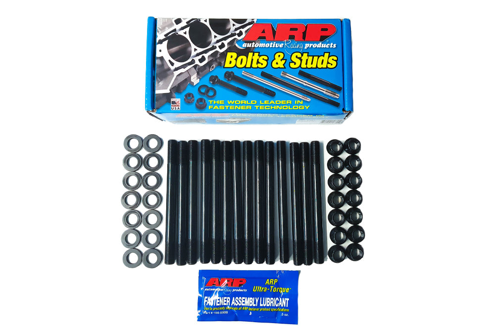 The kit includes fourteen ARP M12 head studs, fourteen parallel ground washers, fourteen chrome moly steel 12 point nuts and ARP Ultra-Torque fastener assembly lubricant.